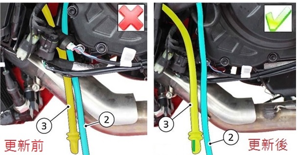 二、經查DUCATI Supersport車型(製造/進口日期: 2017年 ~ 2018年),國內應召回33輛;因汽油箱及/或空氣箱漏放管的原始安裝位置有可能會碰觸到水平缸排氣岐管。在某些情況下,汽油箱及/或空氣箱漏放管與水平缸排氣岐管的碰觸,可能會在摩托車左下區域(電瓶下方)引起漏放管燒熔並產生火花,導致行車上有潛在安全疑慮。車主於接獲車商召回改正之通知後,應儘速回廠更新汽油箱及空氣箱漏放管安裝位置,以避免碰觸到水平缸排氣岐管,所需工作時間為30分鐘。