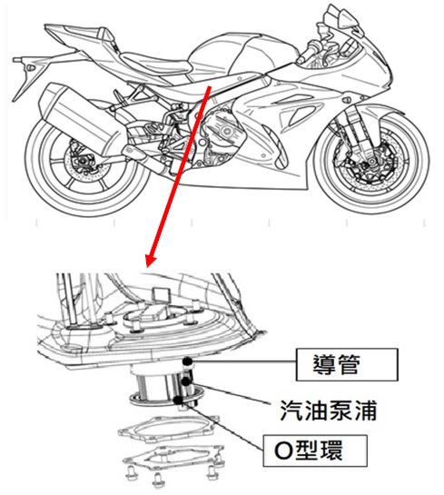 二、經查SUZUKI DL650XA、GSX-S750A、GSX-S750ZA、GSX-R1000A、GSX-R1000R車型(製造/進口日期: 2017年 ~ 2018年),國內應召回458輛;因裝於油箱上的汽油泵浦的密封方式設計不良,所以在汽油泵浦安裝過程中,汽油泵浦上的O型環可能被扭轉。在此情況下,可能因為汽油箱內部壓力的變更,導致密封不良。在最壞的情況下,會造成汽油可能洩漏,恐有影響行車安全。車主於接獲車商召回改正之通知後,應儘速回廠進行汽油泵浦O型環及油箱內部導管更換成對策零件,DL650XA每台工作時間約需1.5小時,GSX-S750A、GSX-S750ZA、GSX-R1000A、GSX-R1000R每台工作時間約需1.0小時。