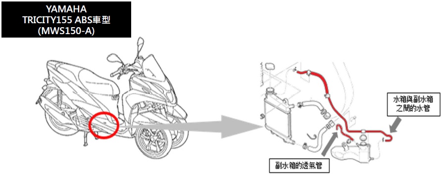 二、經查YAMAHA MWS150-A車型(製造/進口日期: 2017年 3月 ~ 2018年9月),國內應召回838輛;因在製造過程中,材料的配方不適切,造成耐臭氧性不足,因此,該水管暴露於空氣中會早期劣化進而產生龜裂。若車主未注意引擎警示燈之訊息,持續騎乘恐有行車安全之疑慮。車主於接獲車商召回改正之通知後,應儘速回廠更換水箱與副水箱之間的水管以及副水箱的透氣管,工作時間約需1小時。