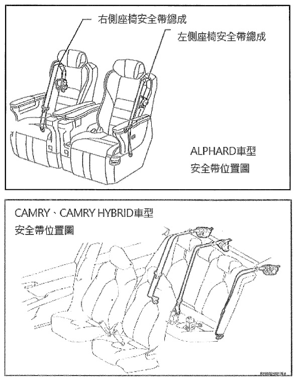 二、經查TOYOTA ALPHARD、CAMRY、CAMRY HYBRID車型(製造/進口日期: 2019年8月 ~ 2019年9月),國內應召回325輛;因安全帶總成製程瑕疵。由於安全帶內織帶感知器的彈簧鎖定機構安裝作業不當,彈簧可能安裝在不正確的位置,而導致該機構未能正常鎖定。在某些嚴重碰撞事故中,織帶感知器可能無法將安全帶鎖定,增加乘員受傷的風險,恐有影響行車安全。車主於接獲車商召回改正之通知後,應儘速回廠檢查安全帶總成並依檢查結果視需要進行安全帶總成更換,檢查作業工作時間約需0.5小時,檢查後若需更換安全帶總成,則工作時間約再需1小時~4小時。