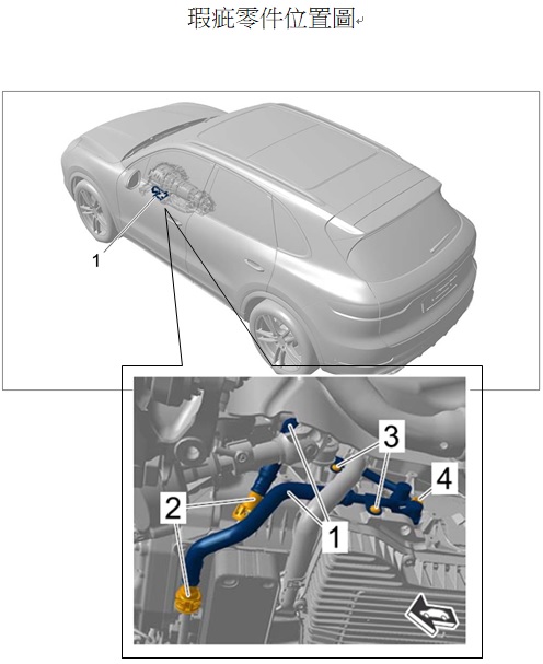 二、經查PORSCHE CAYENNE系列車型(製造/進口日期: 2019年9月 ~ 2019年11月),國內應召回304輛;因供應商使用的材料性質,變速箱油管的接頭與油管之間的摩擦焊接部位可能不符合特定的製造標準,變速箱油將可能從變速箱油管的接頭與油管之間發生洩漏。此洩漏狀況恐對後方的行駛中車輛造成安全性影響,有行車安全之虞。車主於接獲車商召回改正之通知後,應儘速回廠檢查變速箱油管的製造日期,若為受影響的範圍內,則必須更換變速箱油管,工作時間約需110分鐘。
