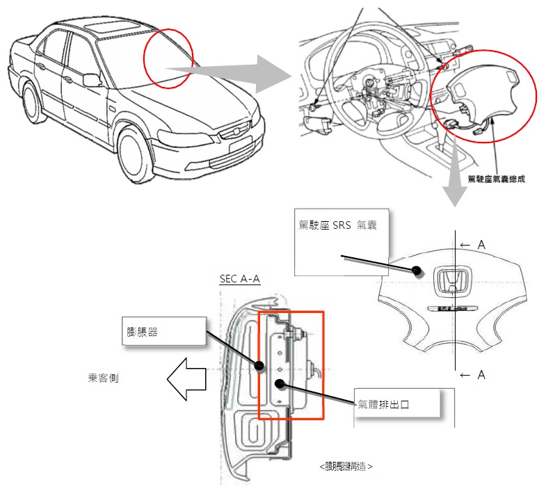 二、經查HONDA CR-V、LEGEND、CIVIC、ACCORD、CITY車型(製造/進口日期: 1995年9月 ~ 1999年12月),國內應召回33061輛;因駕駛座空氣囊膨脹器密封不良。於環境溫度反覆變化後氣囊膨脹器內部產生劣化。當車輛發生碰撞事故且駕駛座氣囊展開時,氣囊內膨脹器之外殼可能會發生破裂、異常展開,飛散的容器碎片恐有造成人員受傷之可能,恐有影響行車安全之虞,甚至造成嚴重受傷及死亡的危險。車主於接獲車商召回改正之通知後,應儘速回廠確認駕駛座氣囊內膨脹器,如為受影響型式,則進行駕駛座氣囊膨脹器更換。工作時間約需0.3~0.5小時。