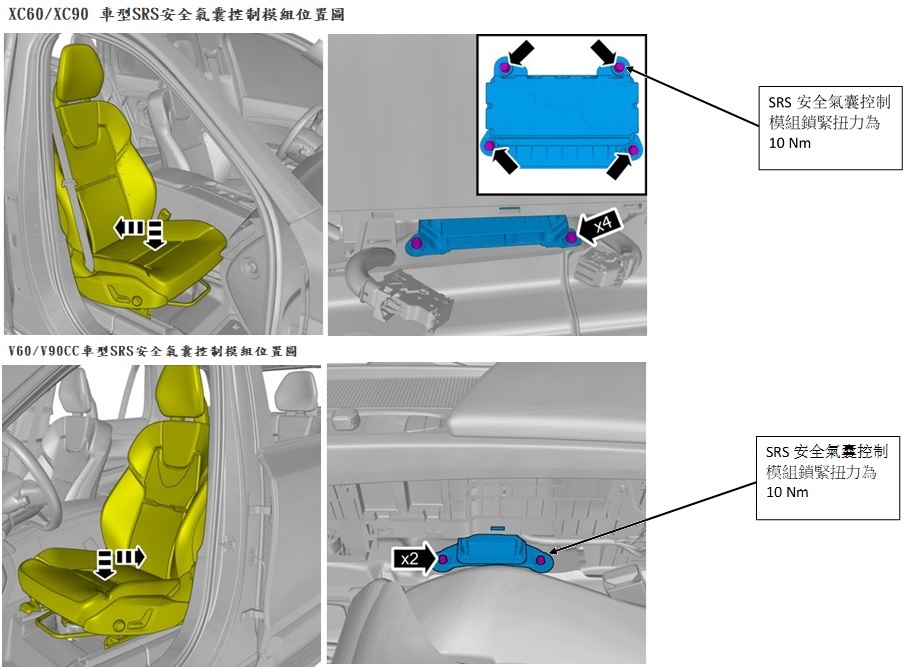 二、經查VOLVO V60、XC60、V90CC、XC90車型(製造/進口日期: 2020年 ~ 2020年),國內應召回63輛;SRS安全氣囊控制模組固定在車體上的固定螺栓可能扭力不足,造成接地線路產生斷路的情況。當警告訊息顯示時,則SRS安全氣囊控制模組無法於撞擊事故發生須作動引爆氣囊充氣以發揮應有的保護功能。另外高壓電瓶應斷電保護的作用也因而未能正常斷電,恐有影響行車安全。車主於接獲車商召回改正之通知後,應儘速回廠檢查SRS安全氣囊控制模組固定螺栓的扭力,若不足10牛頓米(Nm)的標準值則需以扭力扳手上緊至標準值。工時預估約需30分鐘。