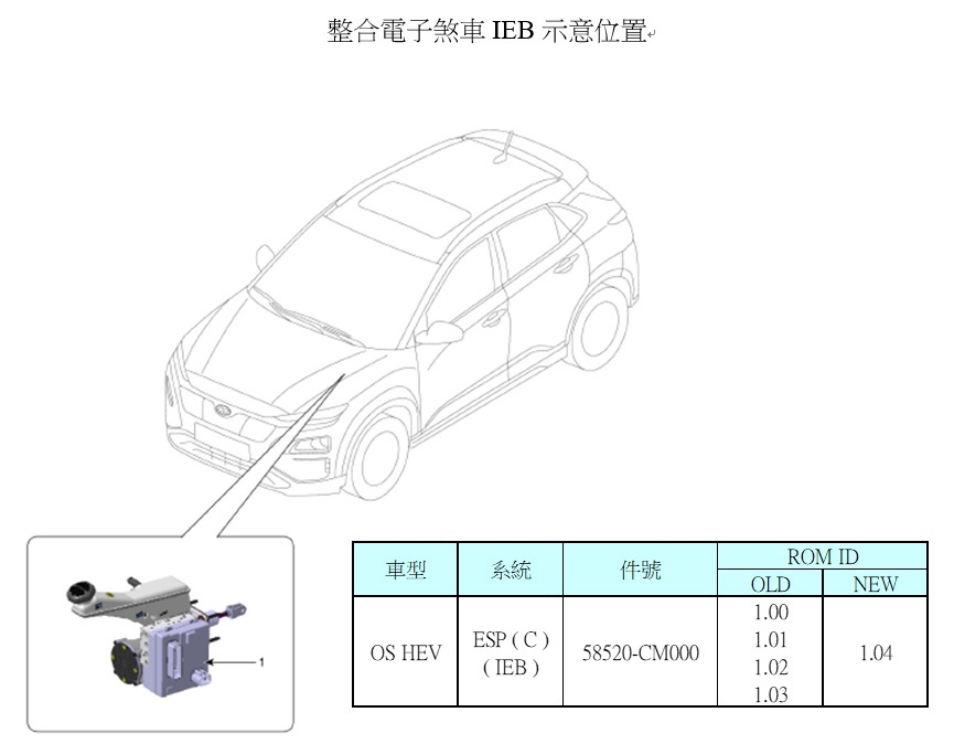 二、經查HYUNDAI KONA HEV車型(製造/進口日期: 2020年),國內應召回151輛;因整合型電子煞車(IEB)內部檢測到異常訊號。檢測到異常信號時,為保護駕駛安全,電腦會限制車輛動力及亮故障指示燈,提醒駕駛返廠進行車輛維修;部分車輛可能發生制動性能降低問題,延長車輛的制動距離並增加發生碰撞的風險。恐有影響行車安全疑慮。車主於接獲車商召回改正之通知後,應儘速回廠確認IEB (整合型電子煞車)軟體版本,如為受影響型式,則進行IEB軟體更新;工作時間:0.3時/台。