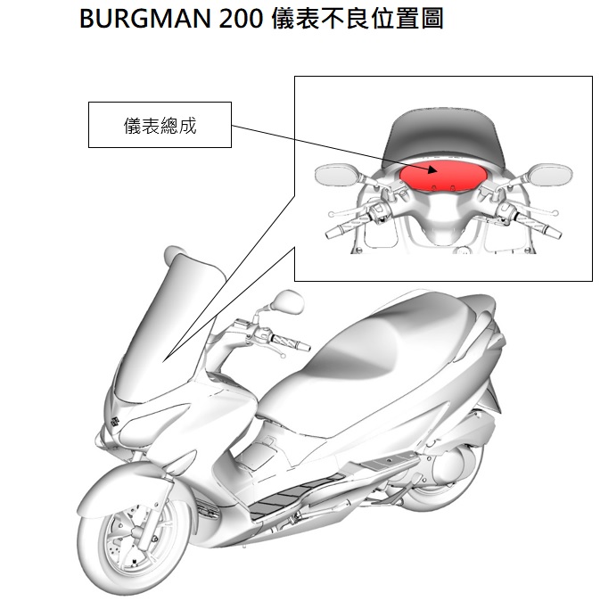 二、經查SUZUKI BURGMAN 200車型(製造/進口日期: 2020年),國內應召回30輛;因儀表內的輪速感知器電源迴路的電阻器耐蝕性不足。因此該電阻器可能腐蝕而導電不良,造成輪速感知器作動不良,導致儀表的速度表和里程表無法正常作動,恐有影響行車安全。車主於接獲車商召回改正之通知後,應儘速回廠進行儀表總成更換,作業時間約1.0小時。
