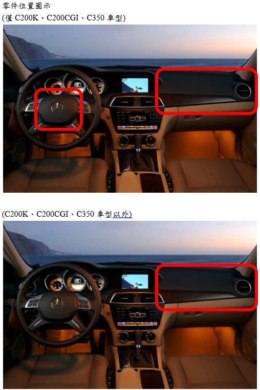 二、經查MERCEDES-BENZ GLK、C-Class、E-Class系列車型(製造/進口日期: 2007 ~ 2016 年),國內應召回3,795輛;因零件製造瑕疵。車輛氣囊充氣元件在罕見的情形下破裂時,氣囊模組可能將無法達到其防護效果,且潛在受到金屬碎片穿透氣囊進入車輛內部,而導致車輛乘員受傷害的風險增加,恐有影響行車安全。車主於接獲車商召回改正之通知後,應儘速回廠進行更換右前乘客座氣囊。另C200K、C200CGI、C350車型(共4輛),需再額外更換駕駛座氣囊。工作時間預計約1.5小時。