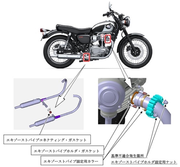 二、經查KAWASAKI W800、W800CAFE車型(製造/進口日期: 2019 ~ 2021 年),國內應召回192輛;由於排氣管可能因為組裝程序不適切導致排氣管固定螺帽鬆脫。最壞的情況下排氣管可能會脫落,恐有影響行車安全疑慮。車主於接獲車商召回改正之通知後,應儘速回廠進行更換新的排氣管墊片組並重新鎖付螺帽,工時約0.5小時。