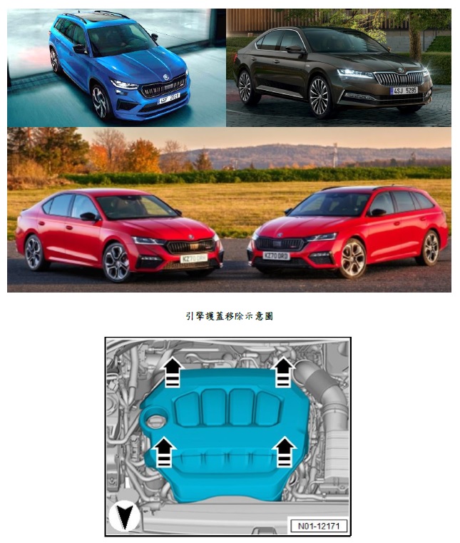 二、經查SKODA KODIAQ、OCTAVIA、SUPERB系列車型(製造/進口日期: 2021 ~ 2022 年),國內應召回379輛;因引擎飾蓋安裝點的固定力量不足,引擎飾蓋可能從其安裝位置鬆脫。可能因為引擎飾蓋於行駛中鬆脫,且接觸到渦輪增壓器,而導致悶燒損壞或可能引起火災,恐有影響行車安全之疑慮。車主於接獲車商召回改正之通知後,應儘速回廠進行移除引擎飾蓋,工作時間約需30分鐘。