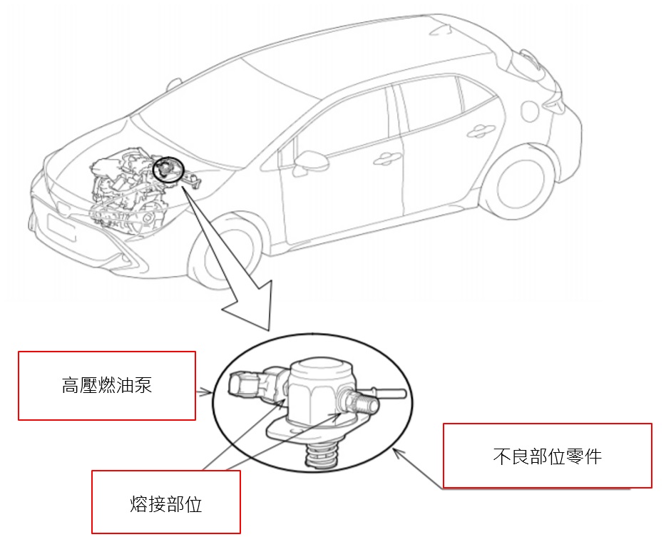 二、經查TOYOTA C-HR車型(製造/進口日期:2019 ~ 2023年),國內應召回7,966輛;由於高壓燃油泵的內部零件壓合組裝後的強度不足。長期使用後可能會造成泵浦零件磨損,導致焊接處應力集中,最嚴重狀況可能產生裂痕並造成燃油洩漏導致行車安全風險提高。車主於接獲車商召回改正之通知後,應儘速回廠進行高壓燃油泵生產序號檢查,如生產序號符合更換序號範圍,將實施更換高壓燃油泵。檢查作業時間約需0.2小時、更換高壓燃油泵約需1.5小時。