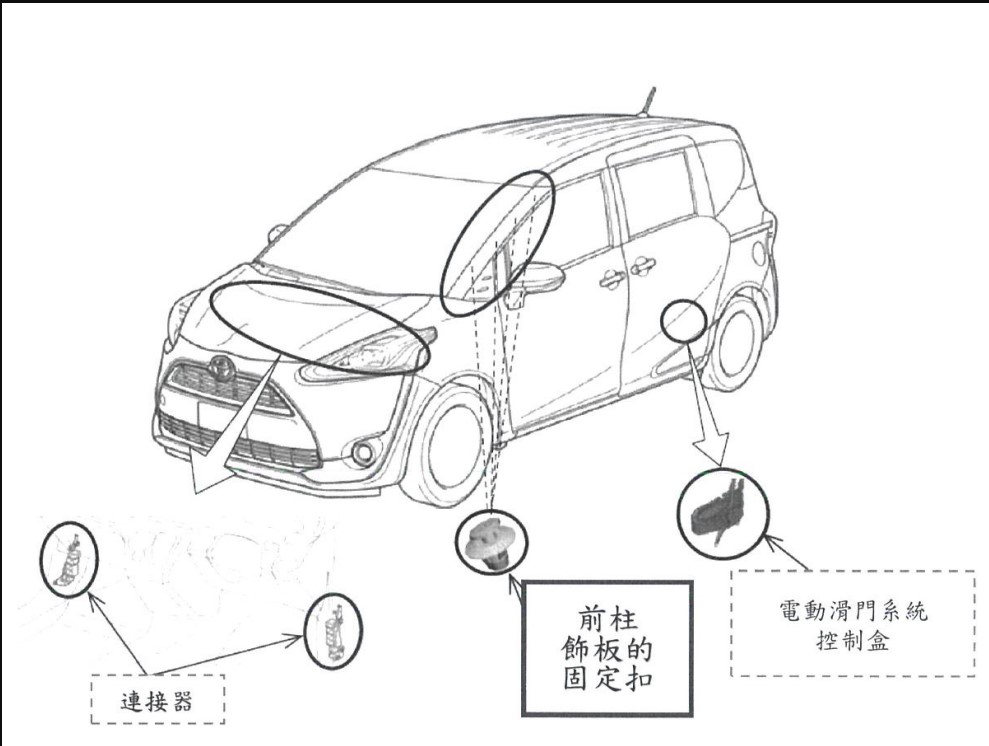 二、經查TOYOTA SIENTA系列車型(製造/進口日期: 2016年7月 ~ 2023年1月),國內應召回46267輛;由於車輛前柱飾板固定扣的墊圈密封材質耐久不良。如果車輛配備電動滑門系統,行駛時電動滑門可能會打開,恐影響行車安全,導致車內乘客受傷的風險。車主於接獲車商召回改正之通知後,應儘速回廠實施免費更換「前柱飾板的固定扣」,作業時間約需1.5小時;如您的愛車為配備電動滑門車型,將再實施免費更新「電動滑門控制單元程式」,作業時間約需2.0小時,另外接頭檢查如有水痕跡的話,尚需塗抹接點保護劑,作業時間約需2.0小時(實際作業時間依服務廠人力、作業安排而略有調整)。