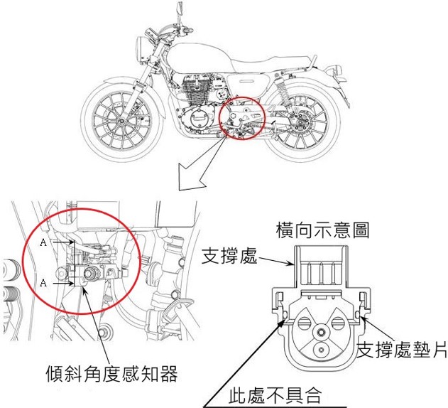 二、經查HONDA H'NESS CB350車型(製造/進口日期:2020年12月),國內應召回1輛;因傾斜角度感知器的支架成型工作及模具管理不當,造成支架密封性不足。在雨中行駛或其他原因造成感知器進水,感知器電路板可能出現短路,導致偵測錯誤。進而讓引擎在行進間熄火,恐有影響行車安全。車主於接獲車商召回改正之通知後,應儘速回廠更換傾斜角度感知器,工作時間約需1小時。