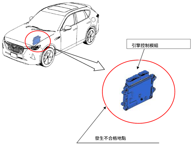 二、經查MAZDA CX-60車型(製造/進口日期:2023年2月~2023年9月),國內應召回38輛;因車輛可能會因引擎控制模組,對於燃油蒸發氣體的控制出現有誤,導致將蒸發氣體導向進氣歧管的放氣閥開關不正確作動。引起過濃的燃氣流入引擎,導致空燃比不正確。極端的狀況下,引擎可能會熄火的風險,恐有影響行車安全的疑慮。車主於接獲車商召回改正之通知後,應儘速回廠執行引擎控制模組軟體更新作業,作業時間約需0.3小時。