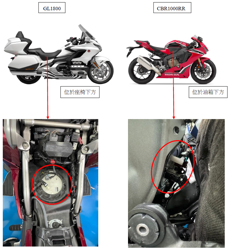二、經查HONDA CBR1000RR、GL1800車型(製造/進口日期:2018年~2023年),國內應召回430輛;因燃油泵浦供應商製程不當。當燃油泵浦葉輪浸於燃油中會造成葉輪膨脹,使得燃油無法被供應。該問題將導致車輛引擎難啟動,以及在行駛中熄火,有影響行車安全之虞。車主於接獲車商召回改正之通知後,應儘速回廠2018-2019年式GL1800、CBR1000RR全數更換燃油泵浦組件;2020-2023年式GL1800檢查燃油泵浦序號,非對策品即進行更換。更換工作時間約0.8小時;檢查工作時間約0.3小時。
