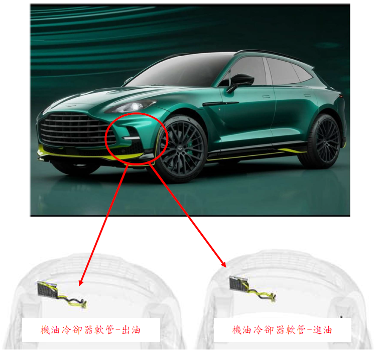 二、經查ASTON MARTIN DBX707車型(製造/進口日期:2022年10月~2023年4月),國內應召回20輛;因機油冷卻器的軟管上有瑕疵。將可能造成零件容易破裂。導致機油和機油壓力損失並讓引擎熄火,從而增加車輛碰撞或火災的風險。車主於接獲車商召回改正之通知後,應儘速回廠更換機油冷卻器的進、出油軟管,工時約需2.5小時。