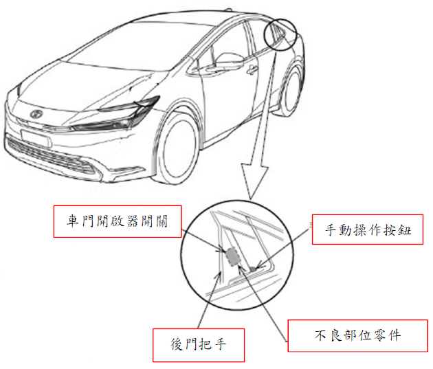 二、經查TOYOTA PRIUS PHEV車型(製造/進口日期:2022年10月~2024年4月),國內應召回801輛;因後車門開啟器開關防水性不佳,若有大量水分噴灑於開關上(例如洗車),可能導致水侵入開關而發生短路。而若短路後車門未上鎖,後車門可能於行進間不預期開啟之風險,同時儀表板會於車輛行駛時顯示警示訊息及發出蜂鳴聲響,若後車門於行駛中或碰撞期間開啟,將增加乘客受傷的風險。車主於接獲車商召回改正之通知後,應儘速回廠更換左、右後車門開啟器開關,作業時間約需1.5小時。