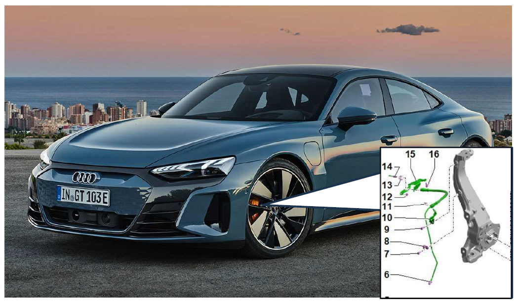 二、經查AUDI E-TRON GT系列車型(製造/進口日期:2022年~2024年),國內應召回253輛;經原廠持續的品質監控下,特定期間所生產的車輛其前軸煞車軟管在使用一段時間後可能會出現裂痕,導致煞車油逐漸洩漏。當煞車油逐漸洩漏,車輛的煞車性能將會受限且煞車踏板行程會變長,若煞車油壺的油量低於下限,恐有影響行車安全之疑慮。車主於接獲車商召回改正之通知後,應儘速回廠更換前軸煞車軟管,施工時間約需2.5小時。