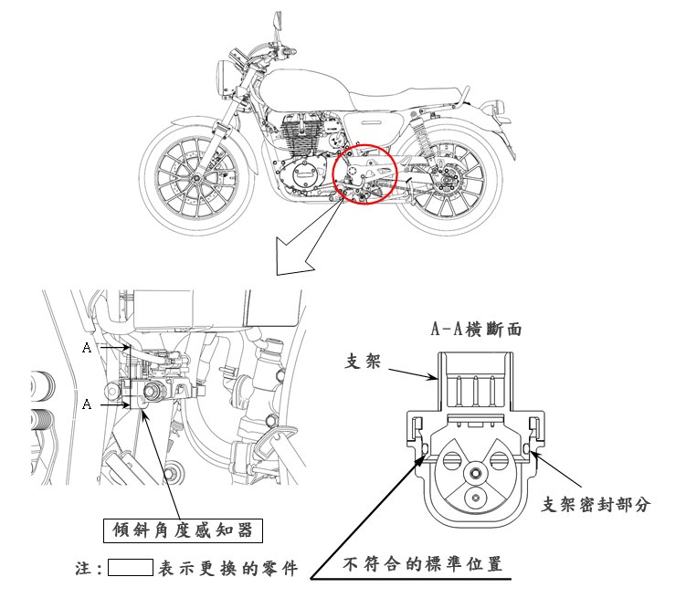 二、經查HONDA H'NESS CB350、CB350 RS車型(製造/進口日期:2020年12月~2022年6月),國內應召回595輛;由於傾斜角度感知器的支架成型工作及模具管理不當,造成支架密封性不足。在雨中行駛或其他原因造成感知器進水,感知器電路板可能出現短路,導致偵測錯誤。進而讓引擎在行進間熄火,恐有影響行車安全。車主於接獲車商召回改正之通知後,應儘速回廠更換傾斜角度感知器,工作時間約需15分鐘。