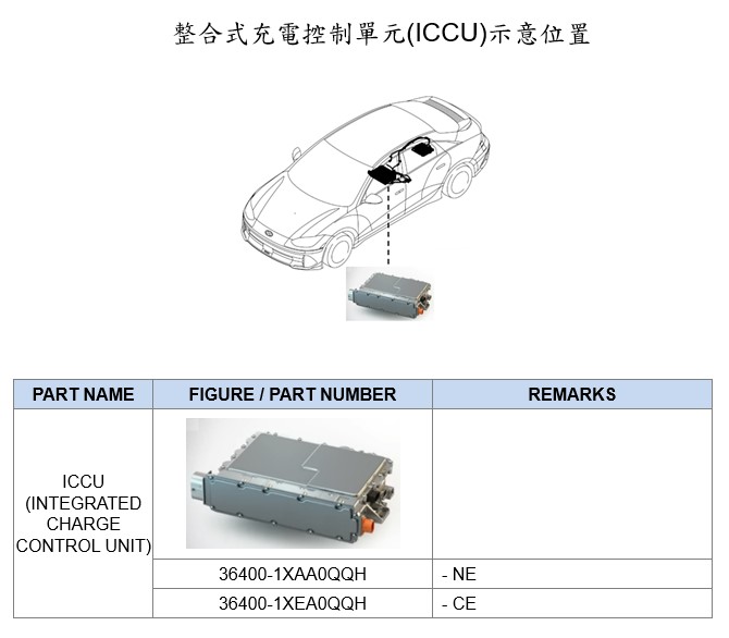二、經查HYUNDAI IONIQ5、IONIQ6車型(製造/進口日期:2021年5月~2024年8月),國內應召回1200輛;因整合式充電控制單元(ICCU)軟體問題。充電過程中,整合式充電控制單元(ICCU)發生過電流時,低電壓轉換器會損壞。可能發生車輛無法啟動或車輛行進間電源控制中斷的安全疑慮,恐有影響行車安全。車主於接獲車商召回改正之通知後,應儘速回廠進行整合式充電控制單元(ICCU)檢查作業,如檢查正常則進行軟體更新,作業時間0.3小時,如有相關診斷代碼將更換控制單元後進行軟體更新,作業時間2.2小時。