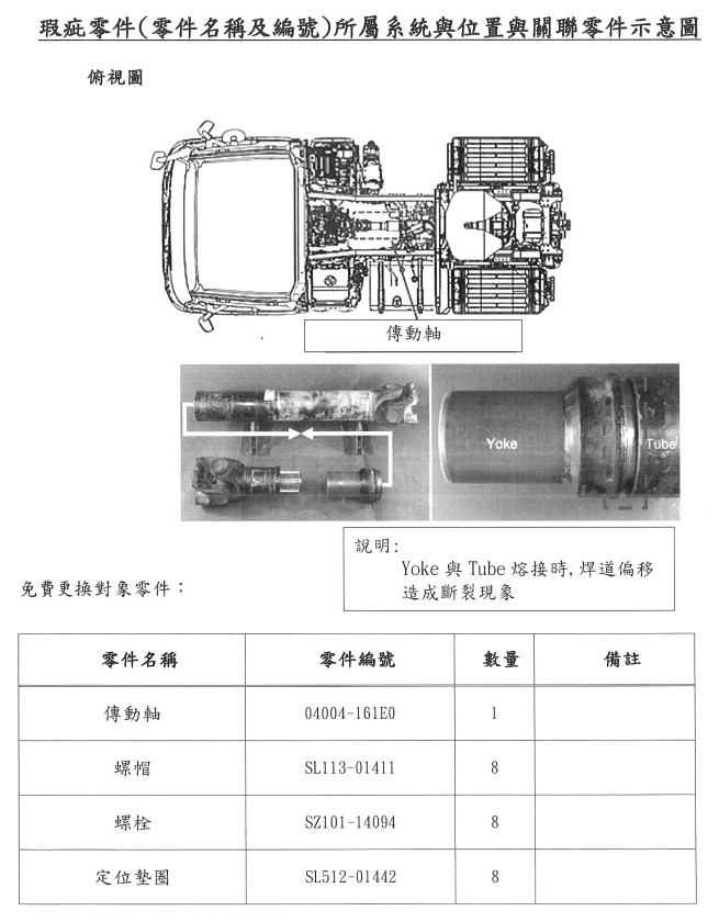 二、經查HINO SH1E車型(製造/進口日期:2022年4月~2022年7月),國內應召回142輛;因傳動軸在熔接過程中發生焊道偏移造成熔接強度低下。最嚴重狀況傳動軸斷裂脫開將導致車輛失去驅動動力而影響行車安全。車主於接獲車商召回改正之通知後,應儘速回廠更換傳動軸,更換傳動軸作業約1.5小時。