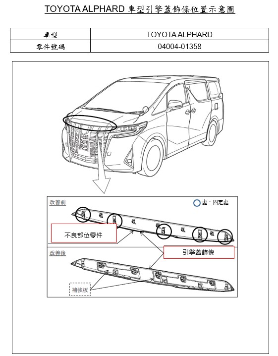 二、經查TOYOTA ALPHARD車型(製造/進口日期: 2020年 7月 ~ 2020年 11月),國內應召回427輛;因引擎蓋飾板安裝結構考慮不足。可能會因為溫度變化而變形,隨著反覆的應力作用於飾板的安裝部位,可能會導致裂痕和鬆動。如果飾板繼續以此狀態使用,可能會從車輛上脫落,並對交通造成影響。車主於接獲車商召回改正之通知後,應儘速回廠執行更換引擎蓋飾條對策品,作業時間約需0.7小時。(實際作業時間依服務廠人力、作業安排而略有調整)。