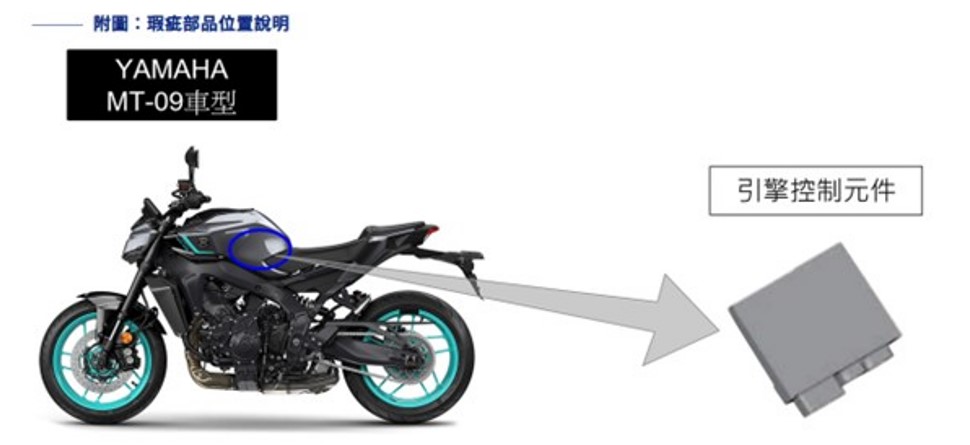 二、經查YAMAHA MT-09車型(製造/進口日期: 2021年 2月 ~ 2024年 8月),國內應召回1,018輛;因引擎控制單元程式的不適切。可能引起節流閥開度感知器的接點位置磨耗,使粉末堆積,導致無法辨識正確的節流閥開度位置,以致引擎轉速異常並可能導致引擎警示燈亮起,最嚴重的情況下,可能會造成熄火,恐有行車安全之疑慮。車主於接獲車商召回改正之通知後,應儘速回廠將引擎控制單元程式更新為對策程式,並將節流閥開度感知器更換新品,工時約需1.5小時。