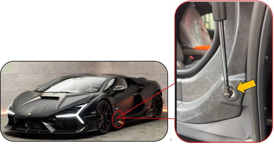 二、經查LAMBORGHINI REVUELTO車型(製造/進口日期: 2024年),國內應召回2輛;因支撐車門氣壓桿之球型銷,可能未依製造規範正確安裝,存在鬆脫的風險。若發生該情況,當車門處於打開位置時,車門可能會向下掉落並對駕駛員或乘客造成衝擊。此外,從車內打開車門時,可能需要過大的力量,人員可能需要額外的時間才能離開車輛。在極端情況下,若人員無法快速下車或車門向下掉落時對駕駛或乘客產生衝擊,則會增加車內乘員受傷風險,恐有影響行車安全疑慮。車主於接獲車商召回改正之通知後,應儘速回廠檢查支撐車門氣壓桿之球型銷是否符合訂立之安全標準值範圍,檢查時間預計約○分鐘,未符合標準者將進行重新鎖付,作業時間約需0.25小時。
