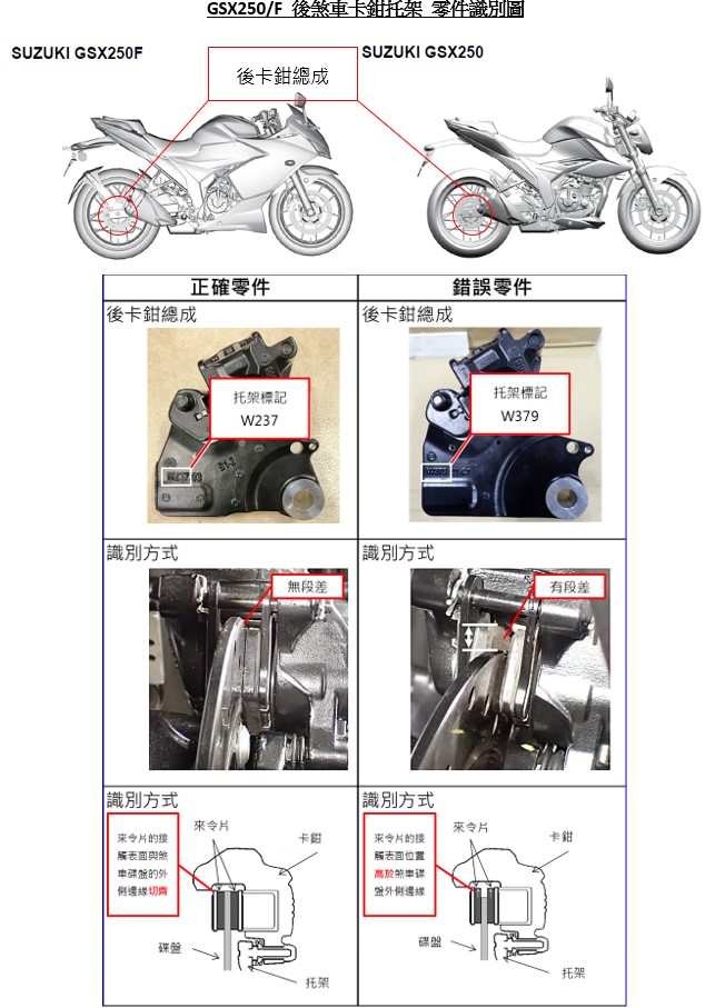 二、經查SUZUKI GIXXER 250、GIXXER SF250車型(製造/進口日期: 2021年 ~ 2024年),國內應召回1,644輛;因生產過程中零件管理不當,部分車輛在後輪煞車系統安裝了不同型號的煞車卡鉗組件。來令片無法與煞車碟盤接觸在正確位置,導致煞車力道降低。在最壞的情況下,將會讓後輪煞車失效,影響行車安全。車主於接獲車商召回改正之通知後,應儘速執行後煞車卡鉗總成檢查,檢查時間約10分鐘。如果檢查有問題,則需更換受影響的零件,作業時間約2小時。
