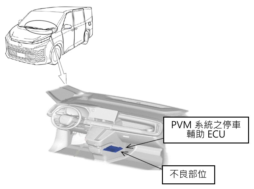 二、經查TOYOTA ALPHARD、CAMRY、CROWN、SIENNA系列車型(製造/進口日期: 2022年9月 ~ 2025年10月),國內應召回10,169輛;對象車輛配備環景影像輔助系統(PVM),用於顯示車輛周圍影像。因其系統內停車輔助ECU程式考量不充份,在特定條件下操作PVM系統可能導致:(1)如果在POWER(點火)開關切換至ON模式後的特定時間內排入倒車檔,後視影像可能會在倒車過程中短暫靜止不動;或(2)如果POWER(點火)開關在特定時間內反覆切換ON與OFF模式,則在下一次POWER(點火)開關切換至ON模式時,後視影像可能無法正常顯示。上述情況可能增加倒車時與行人發生碰撞風險,進而影響行車安全。車主於接獲車商召回改正之通知後,應儘速執行更新停車輔助 ECU 程式,作業時間約需 1小時。
